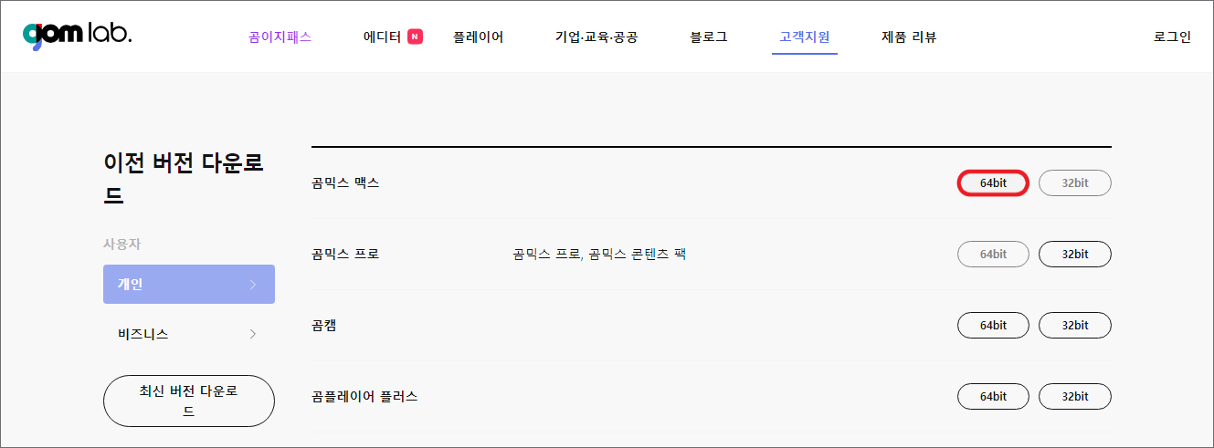 곰랩 공식 사이트에 들어가서 상단에 있는 메뉴 중 [고객지원]-[다운로드]를 클릭하면 '이전 버전 다운로드'가 좌측에 마련되어 있으니 클릭하시면 되는데요.