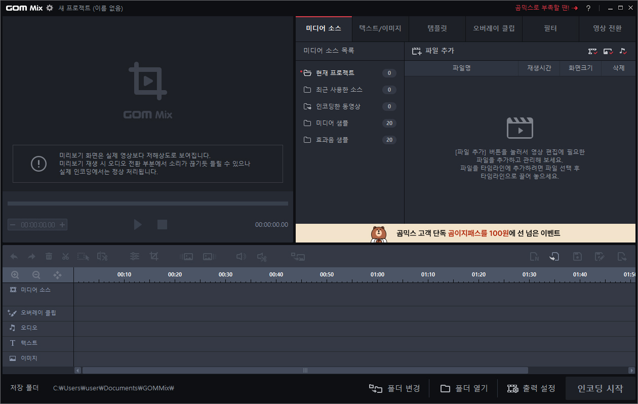 이제 바탕 화면에 추가된 곰믹스 바로가기 아이콘을 더블클릭하면 이렇게 직관적인 인터페이스 구성을 갖춘 옛날 버전의 GOM Mix를 이용할 수 있으니 확인해 보시면 되겠습니다.