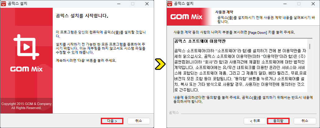 그러면 곰믹스 설치 창이 나타날 텐데 계속 진행하기 위해 [다음]을 누르고 사용권 계약으로 곰믹스 소프트웨어 이용약관의 내용을 읽고 [동의함]을 누르세요.
