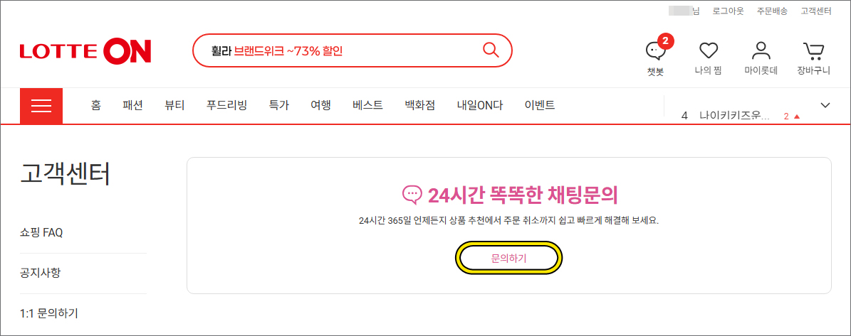 로그인된 상태에서 우측 상단 [고객센터]를 클릭하면 24시간 똑똑한 채팅문의로 상품추천에서 주문 취소까지 쉽고 빠르게 해결할 수 있는 챗봇 이용이 가능한데 [문의하기] 버튼을 누릅니다.