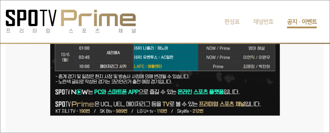 스포티비프라임 채널번호는 KT 지니 TV(190번), SK B tv(989번), LG U+tv(110번), 스카이라이프(212번)이며 TV로 보는 것이기 때문에 큰 화면에서 시청할 수 있는 장점이 있습니다.