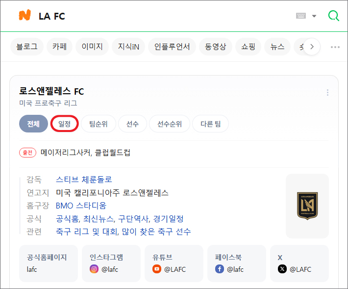 포털 사이트 검색창에 LAFC를 입력하면 검색 결과에서 LAFC 소개 내용과 함께 [일정]도 찾을 수 있으니 클릭해 주세요.