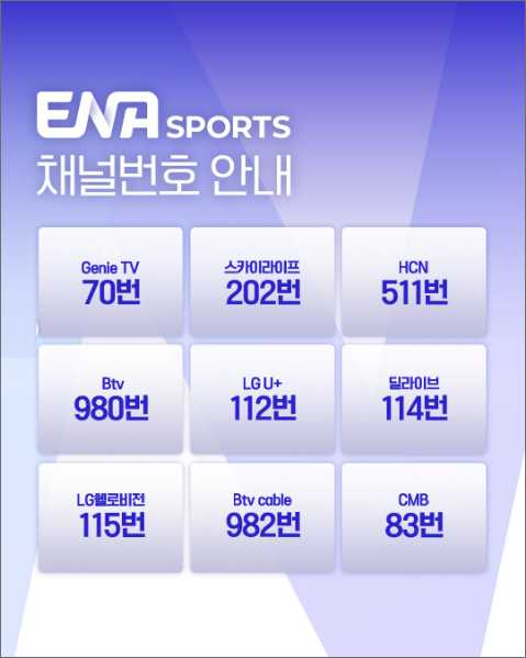 ENA SPORTS 채널번호는 GENIE TV(70번), Btv(980번), U+tv(112번), 스카이라이프(202번), LG헬로비전(115번), 딜라이브(114번), B tv cable(982번), skyHCN(511번), CMB 83번입니다.