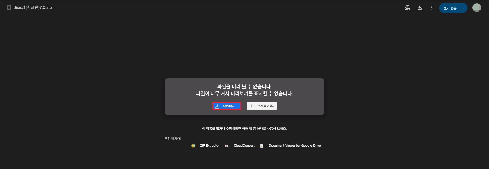 파일이 너무 커서 미리 볼 수 없다는 걸 알리지만 굳이 미리 볼 필요가 없으니 신경 쓰지 않아도 되고 [다운로드] 버튼을 누릅니다.
