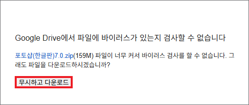 포토샵(한글판) 7.0 zip 파일을 내려받을 수 있는데 바이러스 검사를 할 수 없다고 하지만 파일을 설치해도 문제 될 것이 없기 때문에 [무시하고 다운로드] 버튼을 눌러주세요.