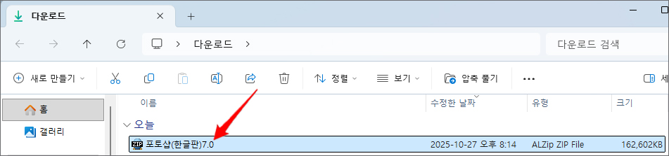 폴더 모양을 클릭해서 지정된 다운로드 폴더를 열고 포토샵(한글판)7.0 압축 파일을 찾았다면 더블클릭해서 압축풀기를 해주세요.