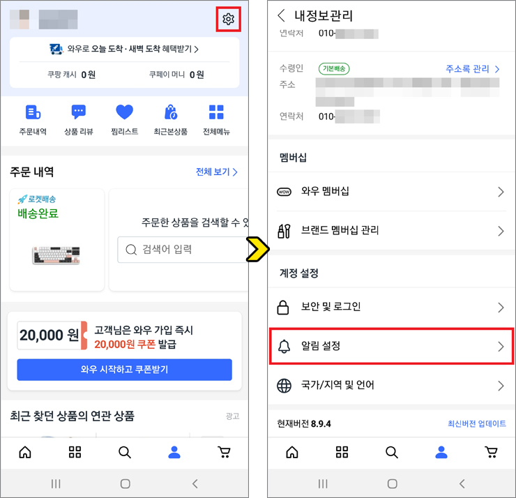 쿠팡 앱 홈 화면이 열리면 기본적인 설정으로 알림이 켜져 있는지 확인해 보실 필요가 있는데요.