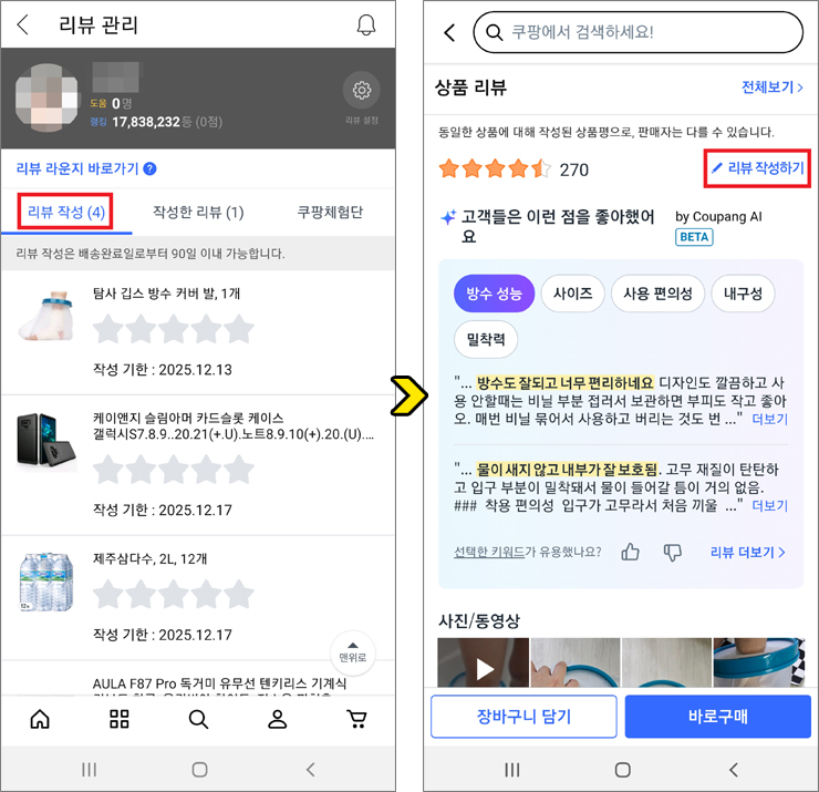 리뷰 작성 시 사진은 3~10장 정도 넣어주시면 되는데 포장 상태, 제품 전체 샷, 디테일 샷, 실제 사용 등 다양하게 찍어주시면 되고 동영상은 필수가 아니지만 추가하면 점수가 플러스될 수 있으니 신경 써줄 필요가 있을 거예요.