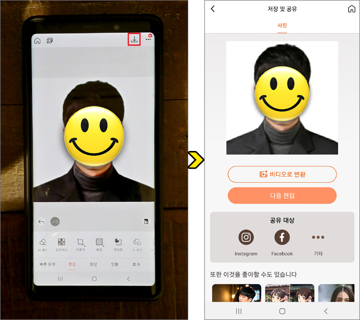 이제 우측 상단에 있는 아래 방향의 아이콘(내보내기)을 누르면 편집한 사진을 앨범에 저장하거나 공유할 수 있으며 이후 온라인 신청으로 편집한 사진을 제출해서 사용할 수 있을 거예요.
