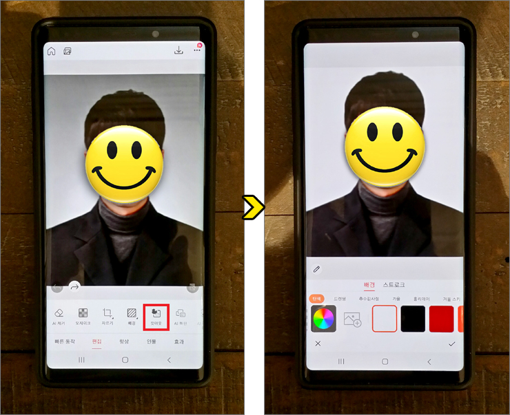 갤러리 앨범에서 준비한 사진을 찾고 선택한 다음 편집 화면 밑에 있는 메뉴 중 컷아웃을 누릅니다.