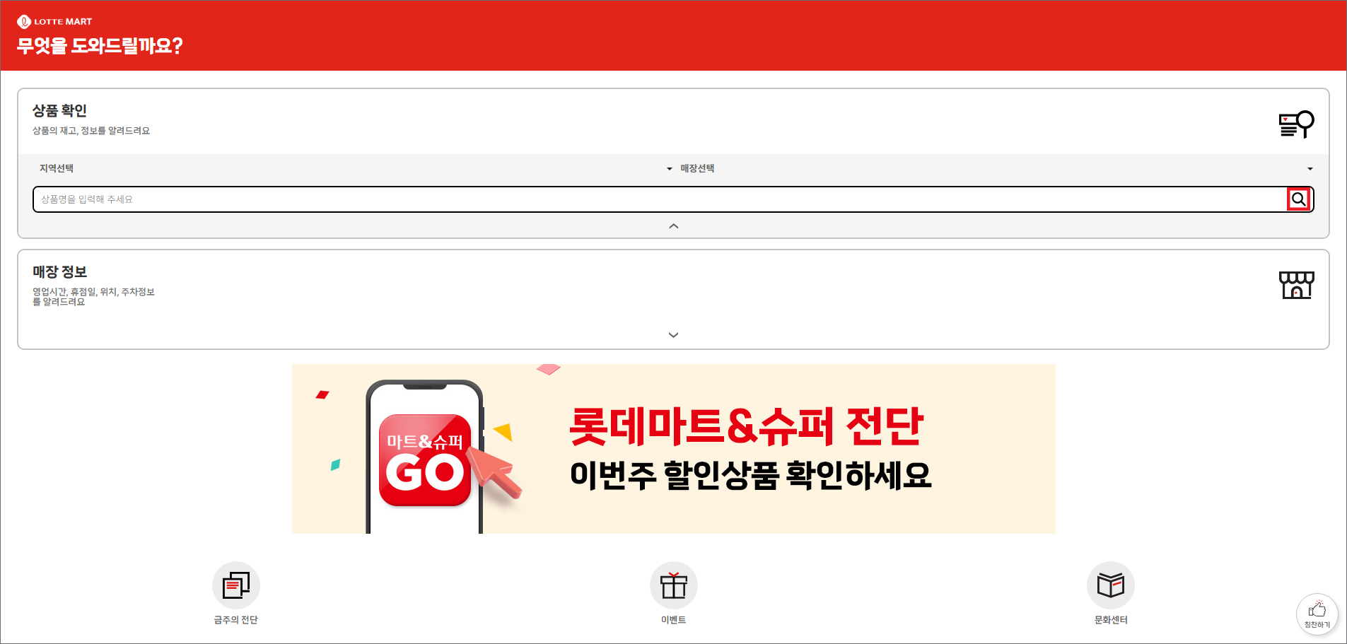 이럴 땐 '롯데마트 도와센터'를 이용하면 빠르게 알아볼 수 있는데 롯데마트 도와센터는 웹 기반이라서 별도의 앱 설치 또는 로그인 없이 누구나 무료로 이용할 수 있습니다.