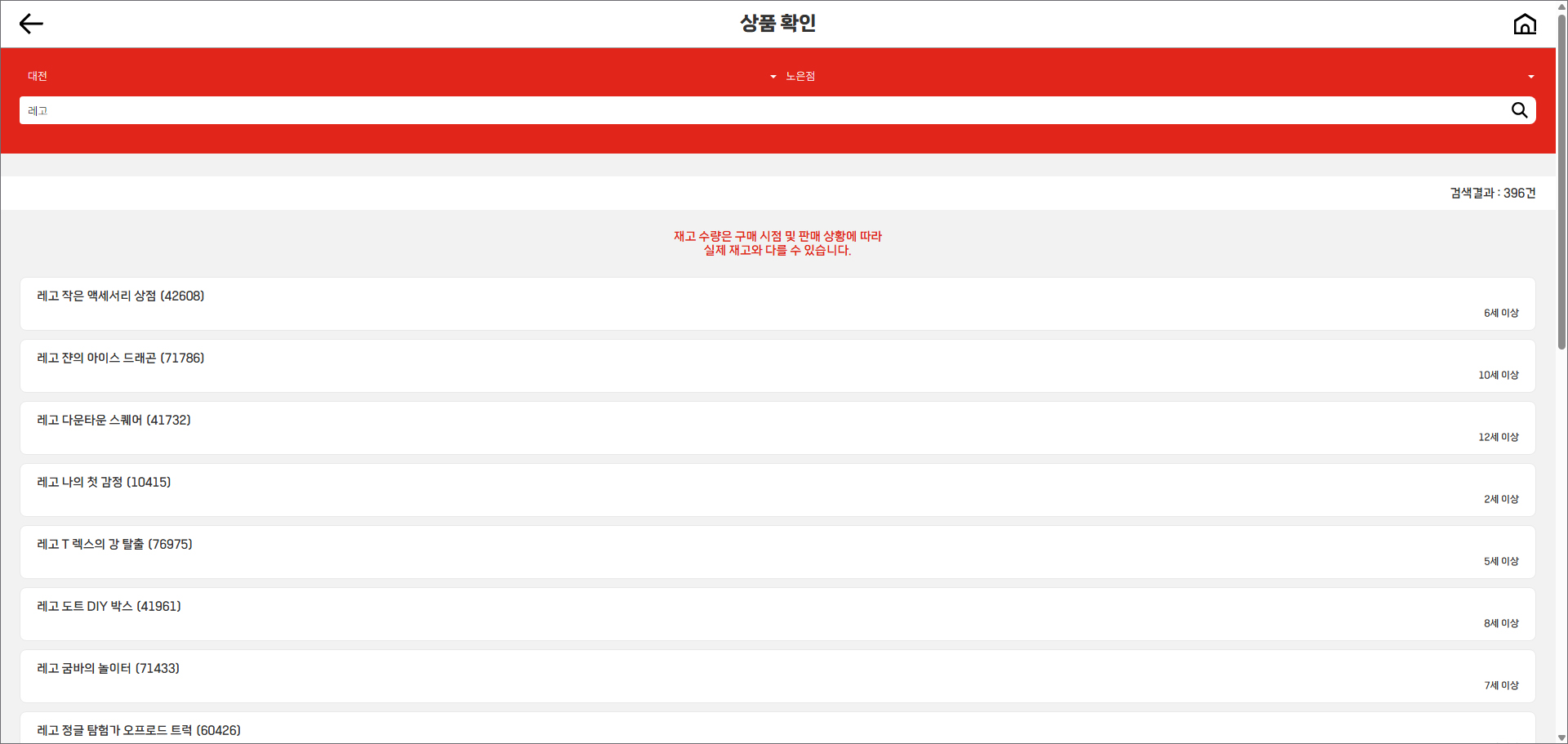 지역선택과 매장선택을 각각 눌러서 선택한 다음 상품명 입력란에 찾으려는 상품명을 입력 후 돋보기 모양을 클릭하면 상품 재고를 알아볼 수 있습니다.