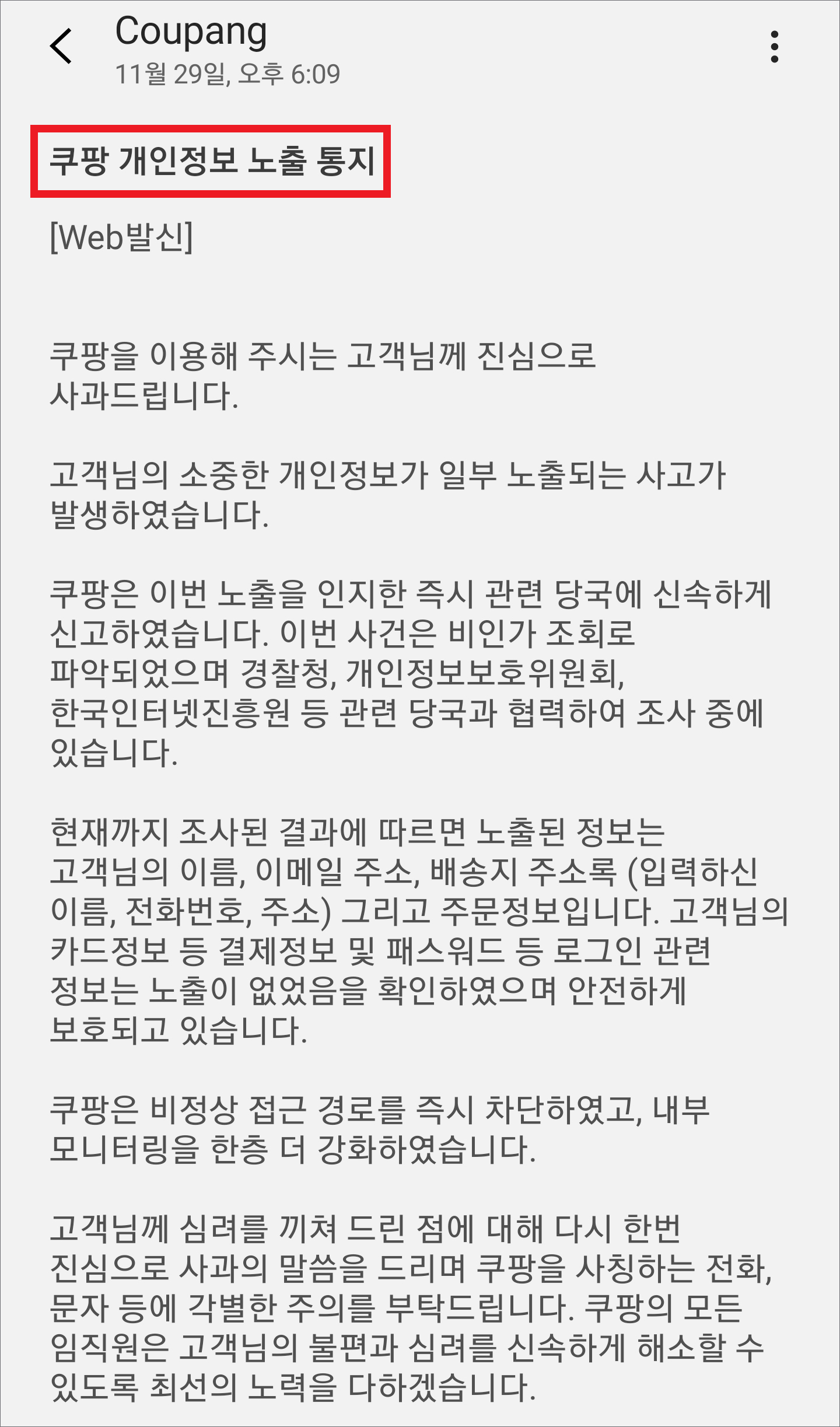 이번 시간은 쿠팡 개인정보 유출 확인 관련 정보를 알려드릴게요. 금일 오후 쿠팡에서 문자가 와서 확인해 봤는데 개인정보 노출 통지라는 내용을 보게 되어 갑작스러우면서 놀랐고 자세히 읽어보니 개인정보 일부가 노출되는 사고가 발생했다는 내용이었습니다.