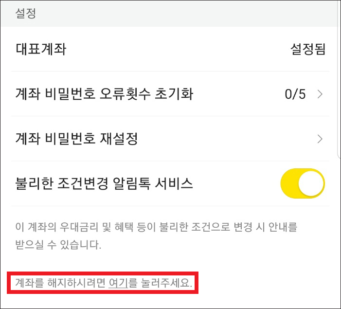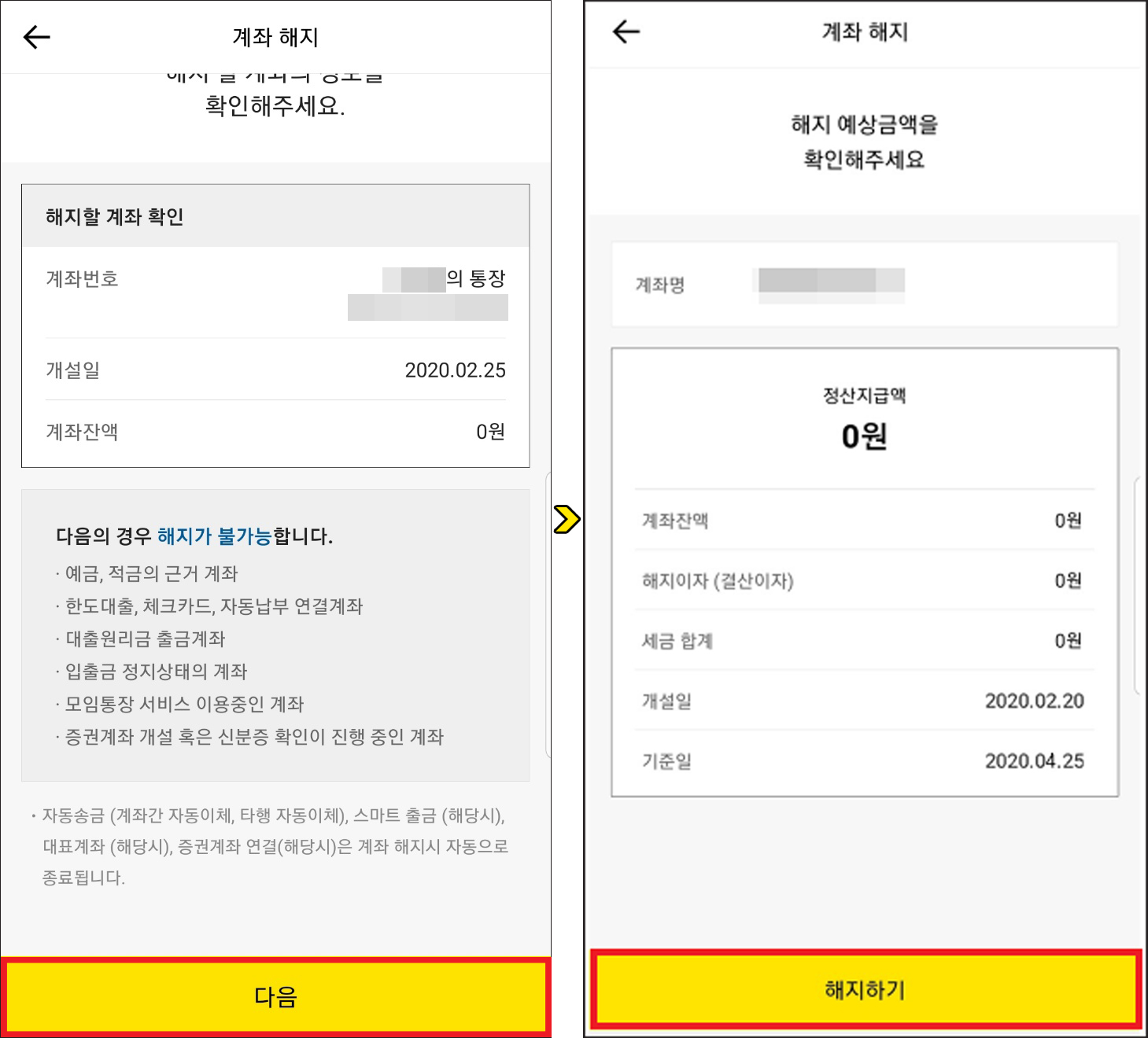참고로 예금, 적금의 근거 계좌, 한도대출, 체크카드, 자동납부 연결계좌, 대출원리금 출금계좌, 입출금 정지상태의 계좌, 모임통장 서비스 이용 중인 계좌, 증권계좌 개설 혹은 신분증 확인이 진행 중인 계좌는 해지가 불가능하니 알고 계시면 되겠고요.