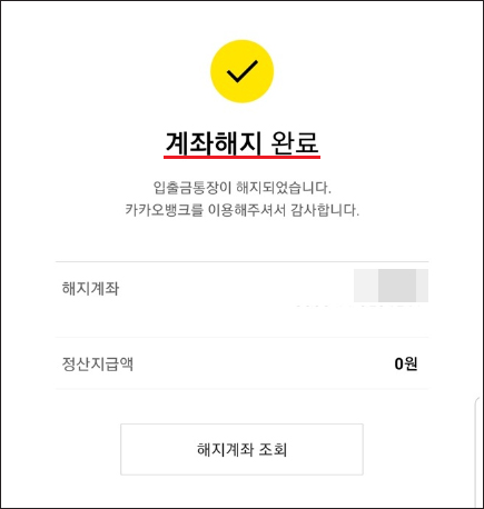 정상적으로 처리되면 계좌해지 완료를 알리는 화면이 뜰 것이며 입출금통장이 해지되었고 카카오뱅크를 이용해주셔서 감사하다는 내용을 볼 수 있게 될 테니 정리하기로 마음먹은 분들은 알려드린 내용을 참고해서 동일하게 진행하면 될 것입니다.