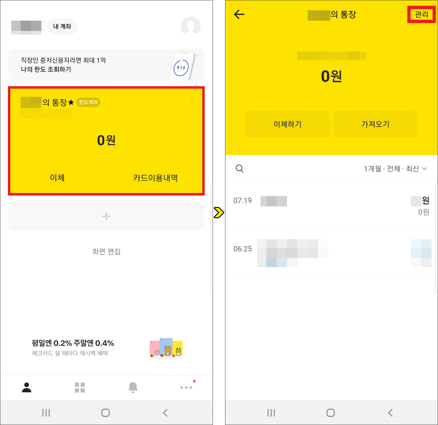 해당사항이 없다면 우선 카카오뱅크 앱을 실행한 다음 해지하기 전에 잔고를 비우고 시작해야 되니 잔액을 다른 계좌에 이체한 상태에서 통장을 선택해 주시고 넘어간 화면 우측 상단에 [관리]를 눌러주세요.