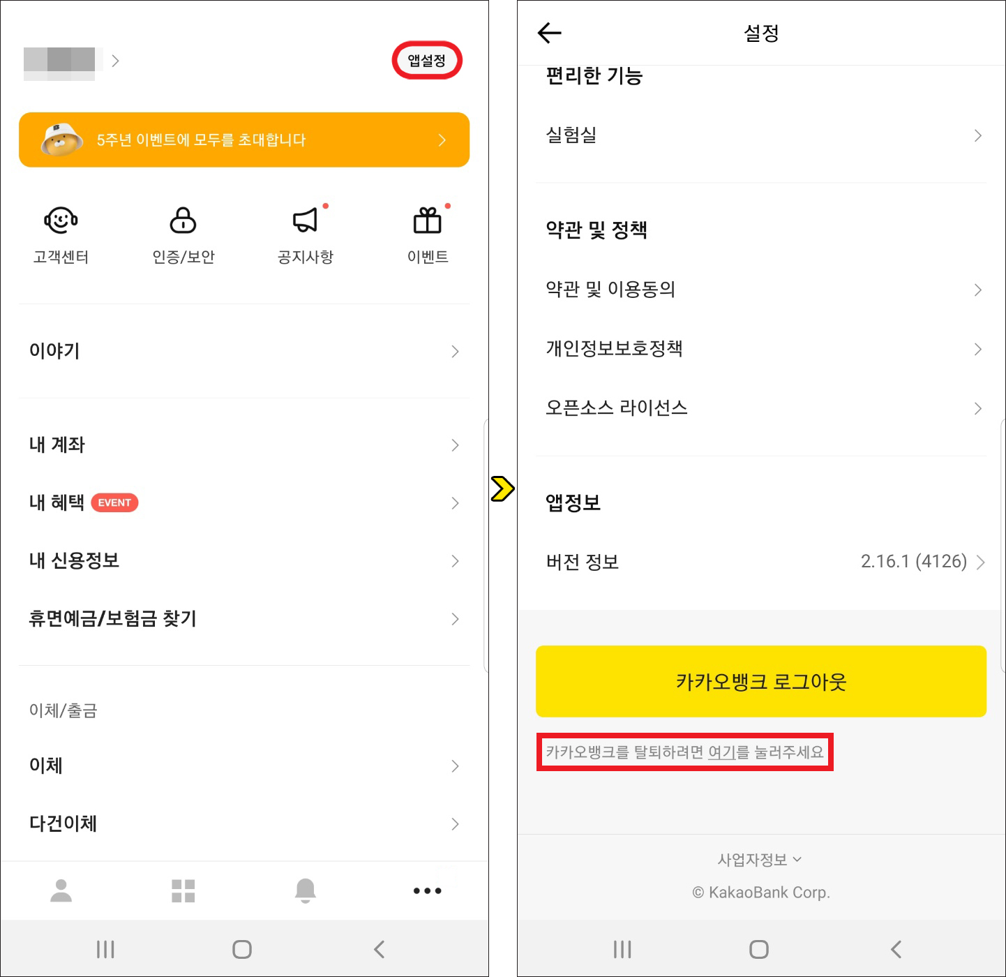탈퇴는 앱을 실행한 상태에서 우측 하단에 점 3개를 누르고 우측 상단에 [앱 설정]을 눌러 넘어간 화면에서 맨 아래를 보면 '카카오뱅크를 탈퇴하려면 여기를 눌러주세요'의 문구가 있으니 눌러서 다음 단계로 이동합니다.
