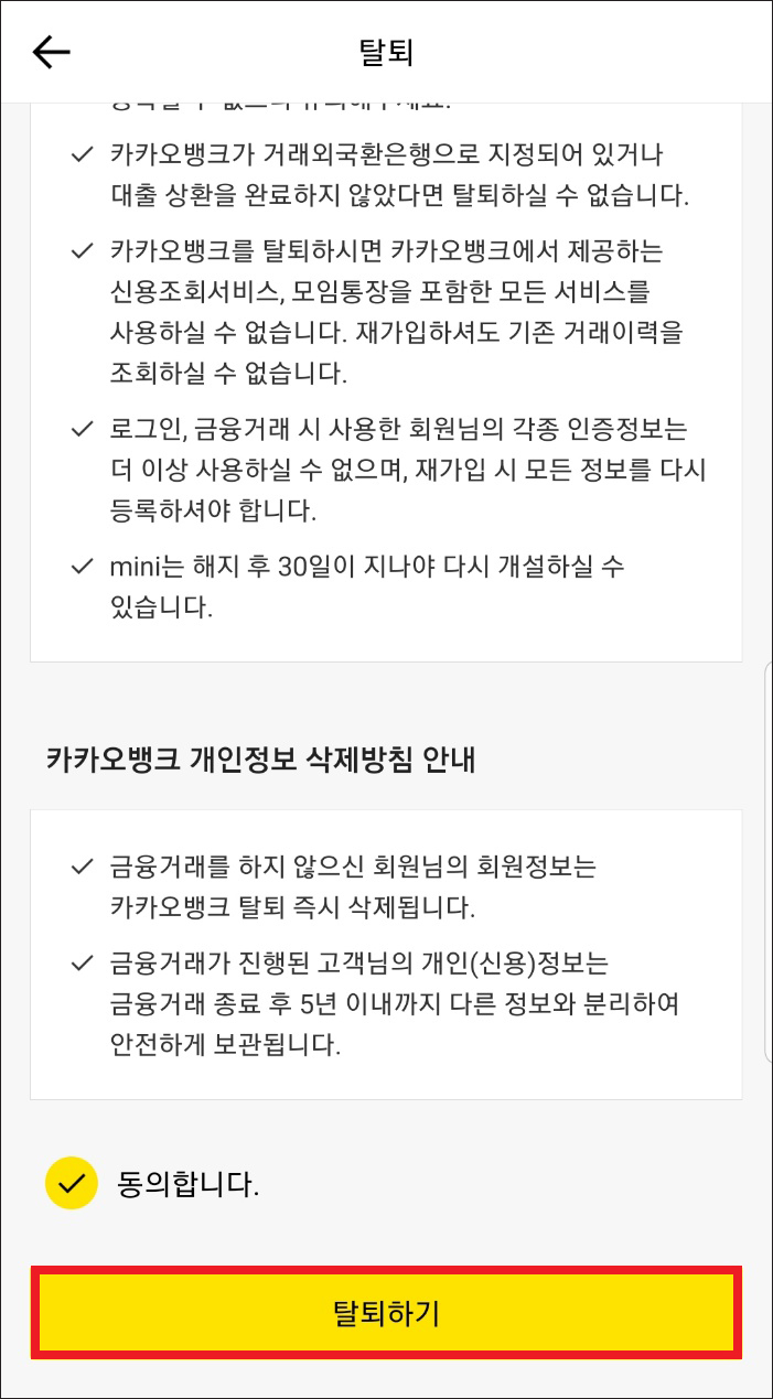 그러면 카뱅 탈퇴 시 어떻게 처리되고 개인정보 삭제방침에 관한 내용을 안내하는데 읽어본 후 동의함에 체크해서 [탈퇴하기]를 눌러주시면 돼요.