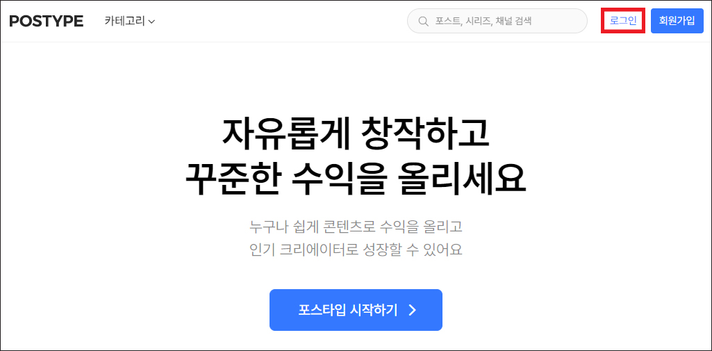모바일 앱 또는 웹 환경에서 진행할 수 있는데 PC 버전의 사이트 기준으로 알려드리면 우선 검색을 통해 포스타입의 메인 홈 화면을 열어준 다음 우측 상단에 있는 [로그인]을 눌러 접속을 해줍니다.